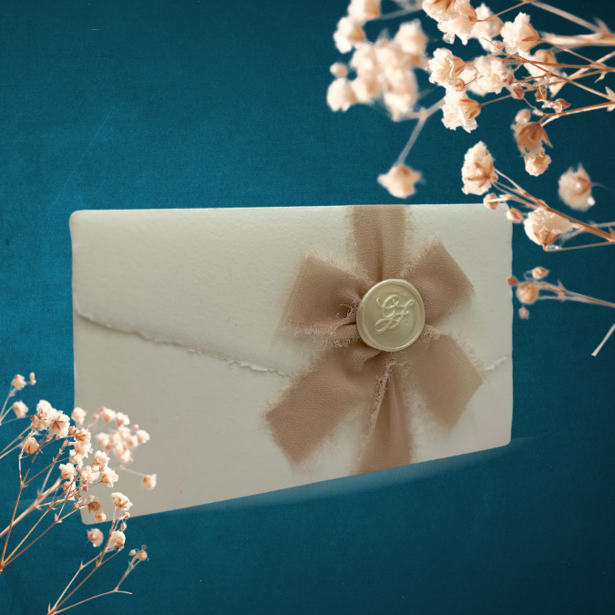 Ogni partecipazione è impreziosita da un nastro in seta o raso, che aggiunge un elemento di delicatezza e armonia al design, mentre il timbro in ceralacca personalizzato conferisce un aspetto unico e sofisticato, rendendo ogni invito un vero pezzo d'arte. Il timbro, realizzato con la tua iniziale o un monogramma speciale, è l'ideale per sigillare il tuo invito con un dettaglio che racconta la tua storia.