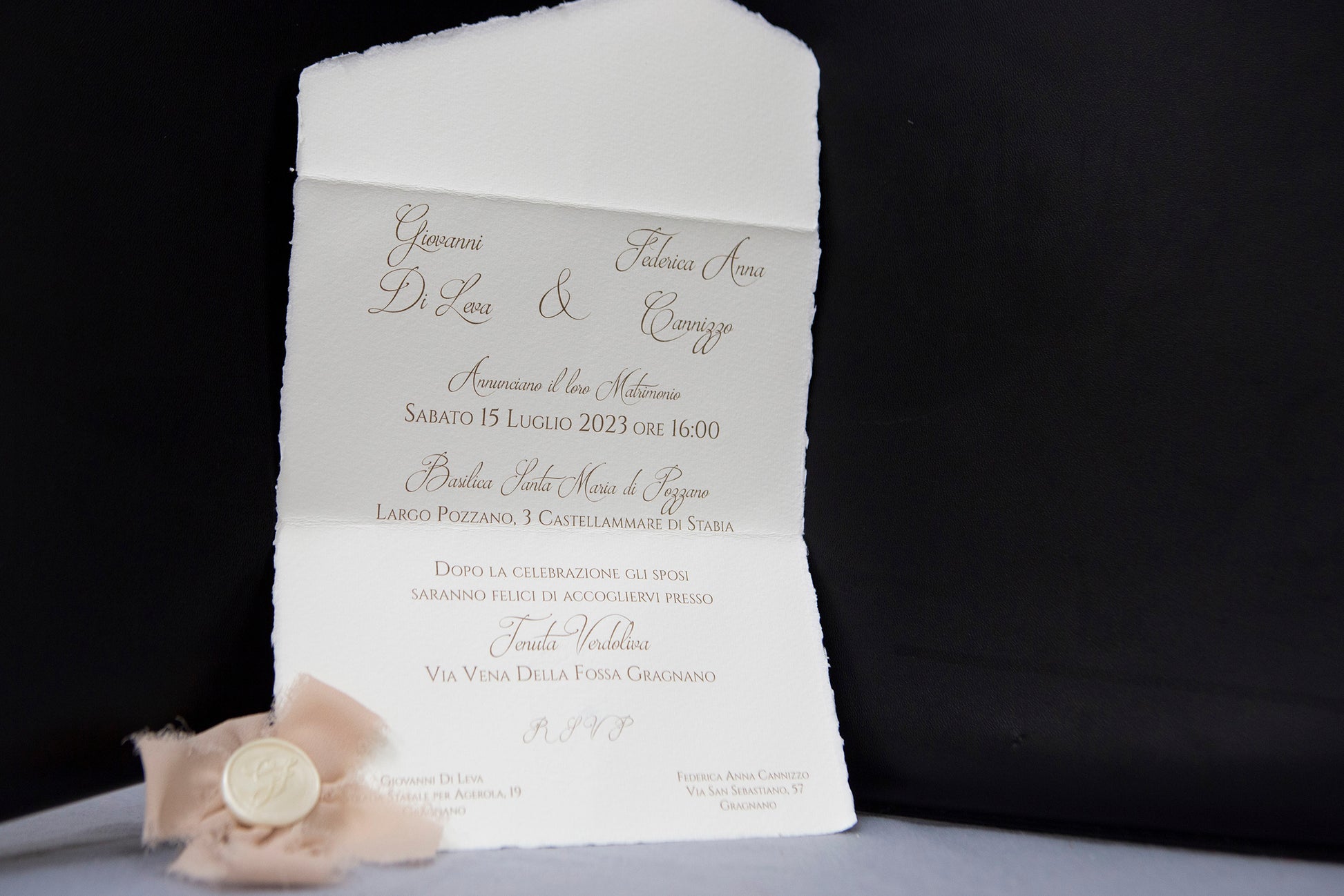 Scopri l’eleganza senza tempo delle nostre partecipazioni in carta Amalfi, un vero e proprio capolavoro artigianale che riflette la bellezza e la raffinatezza delle tradizioni italiane. Realizzate con carta pregiata, proveniente dalla storica città di Amalfi, queste partecipazioni donano un tocco di classe ed esclusività al tuo matrimonio o evento speciale.